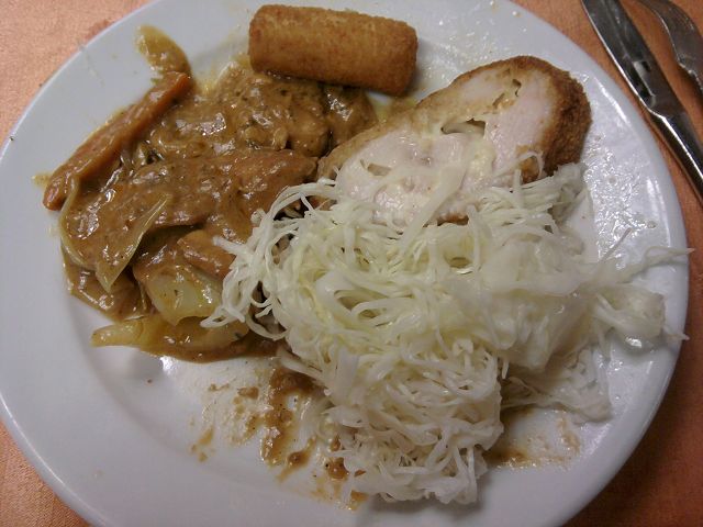 Roladki z ryby, roladki z kurczaka, jakiś gulasz z dużą ilością cebuli i papryki, nuggetsy, karkówka w sosie, kiełbasa paprykowa |